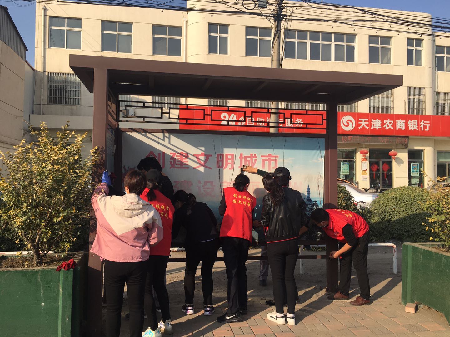 上午兩點(diǎn),志愿者分為兩隊(duì)到達(dá)目的地洇溜丁字路口,開始此次公交站牌擦拭活動。一隊(duì)向東活動,另一隊(duì)向西活動。雖然天氣有些涼意,但都沒有影響隊(duì)員們的熱情,大家拿起手中的抹布,用力擦拭表面和金屬邊框的塵土污垢,耐心清理頑固污漬,為了將站牌徹底清理,不留死角,隊(duì)員們彎下腰、踮起腳,以認(rèn)真負(fù)責(zé)的態(tài)度對站牌進(jìn)行清理擦洗。在大家齊心協(xié)力的清理下,共清理站牌和公交站點(diǎn)62個(gè),原本因常年經(jīng)受風(fēng)吹日曬而布滿塵垢的站牌和公交站臺煥然一新,還出行百姓們一個(gè)好心情。